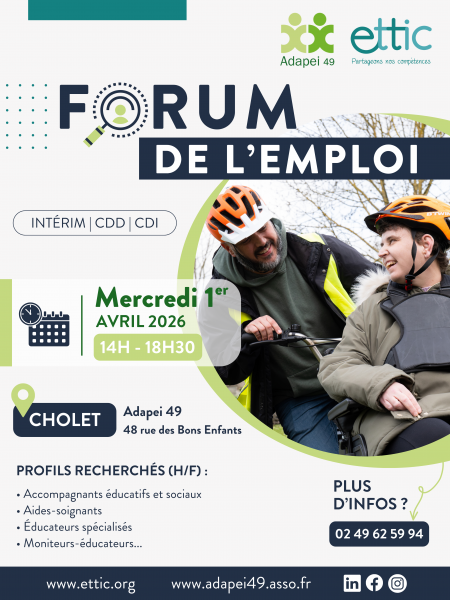 Venez au Forum de l'emploi, le mercredi 1 avril 2026, de 14h à 18h30, au 48 rue des Bons enfants à Cholet.